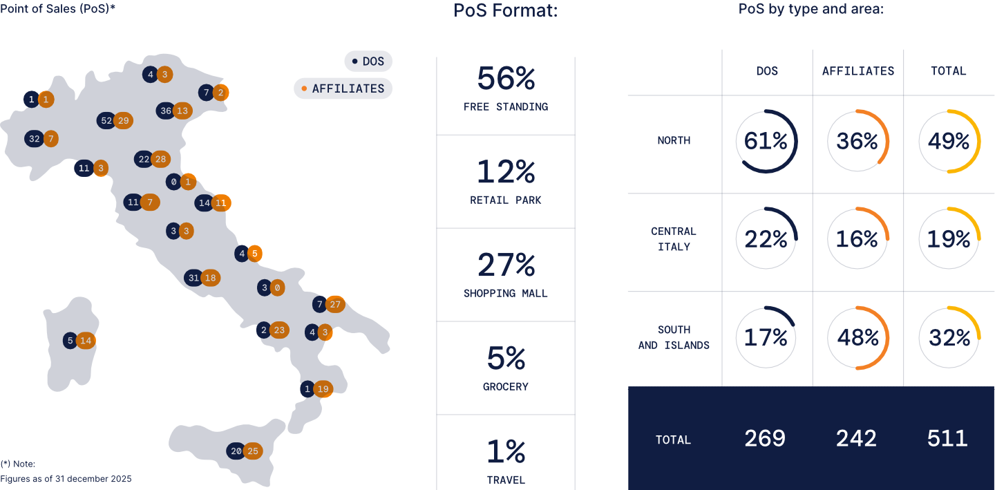 269 points of sale located within both shopping malls and city centres, with average dimensions of around 1500 m2 and different formats: shopping malls, free standing, retail parks and large-scale retail trade.
